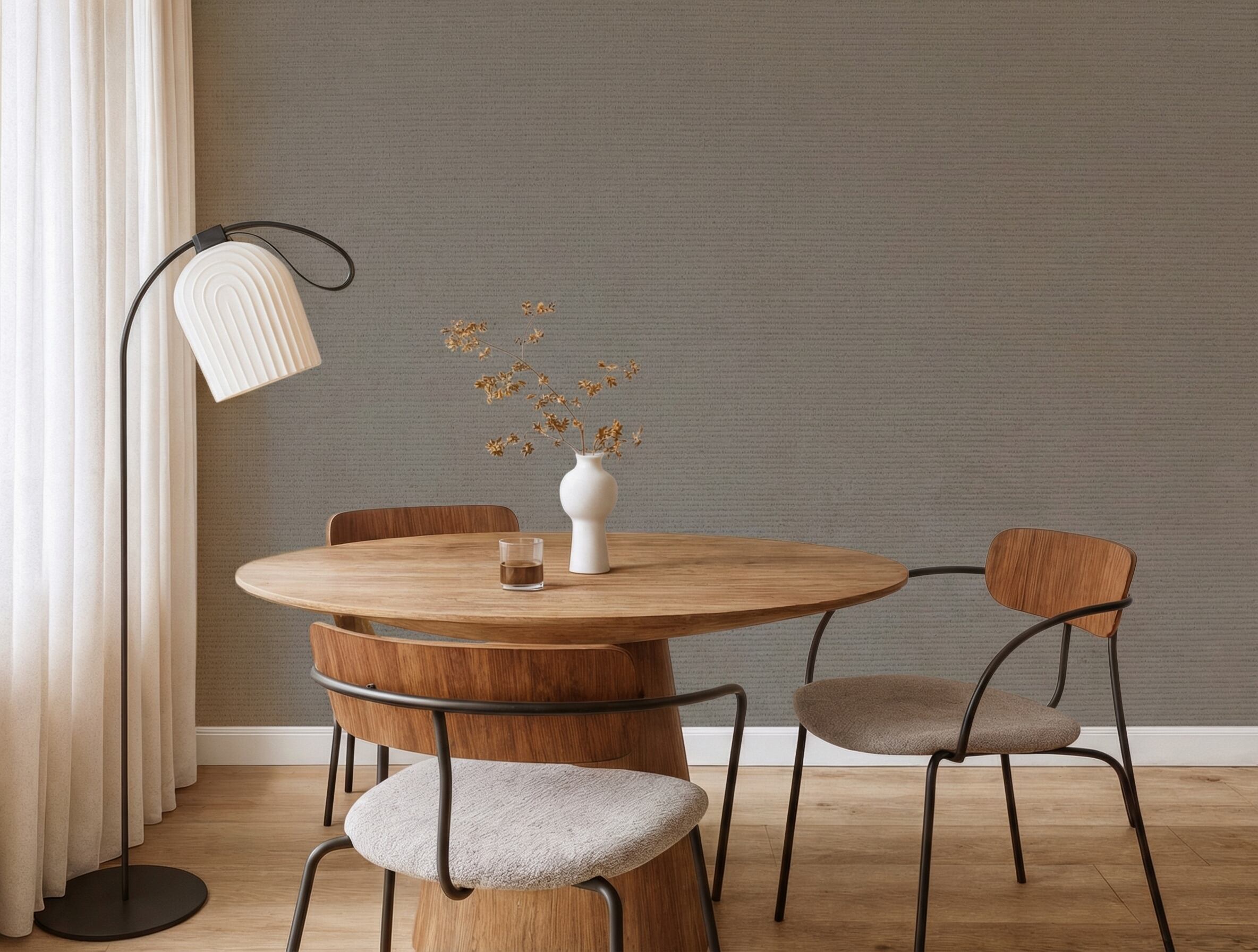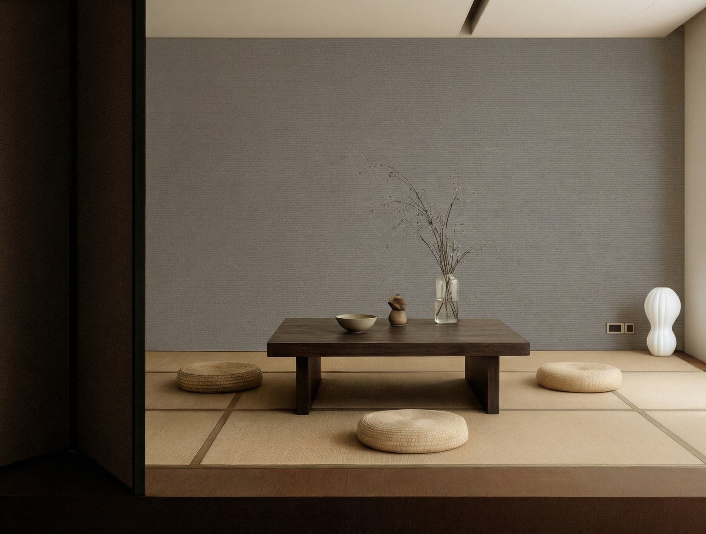 煤のもつ奥行きある色合いと、ほの暗い光の静寂から着想をSusuiro は、深みのあるグレートーンと繊細な織りの質感が特徴です。重くなりすぎることなく、空間に思索的で落ち着いた雰囲気をもたらします。静かな均衡を保つ、余韻のある背景です。