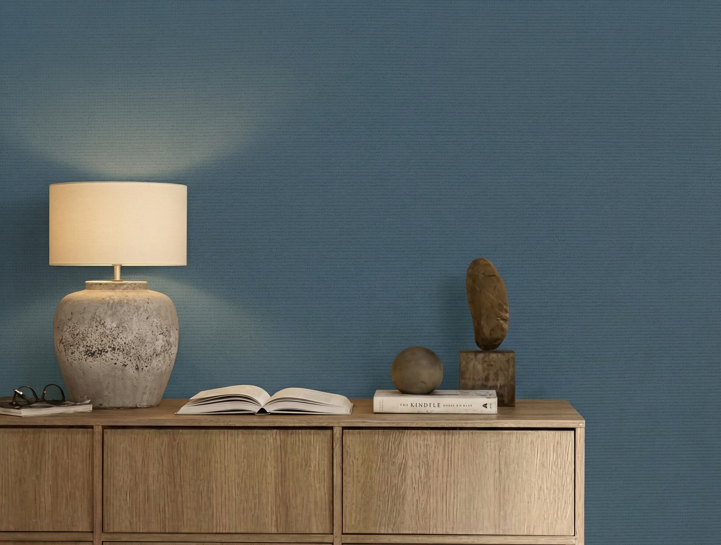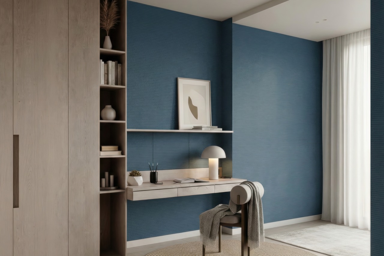 Omeshionandoは、着物文化に由来する御召御納戸の色味を映したジ壁紙です。抑えた青が持つ端正さと、繊細な質感が空間に落ち着いた緊張感を与えます。主張することなく、品格と時間の深みを静かに語る色です。