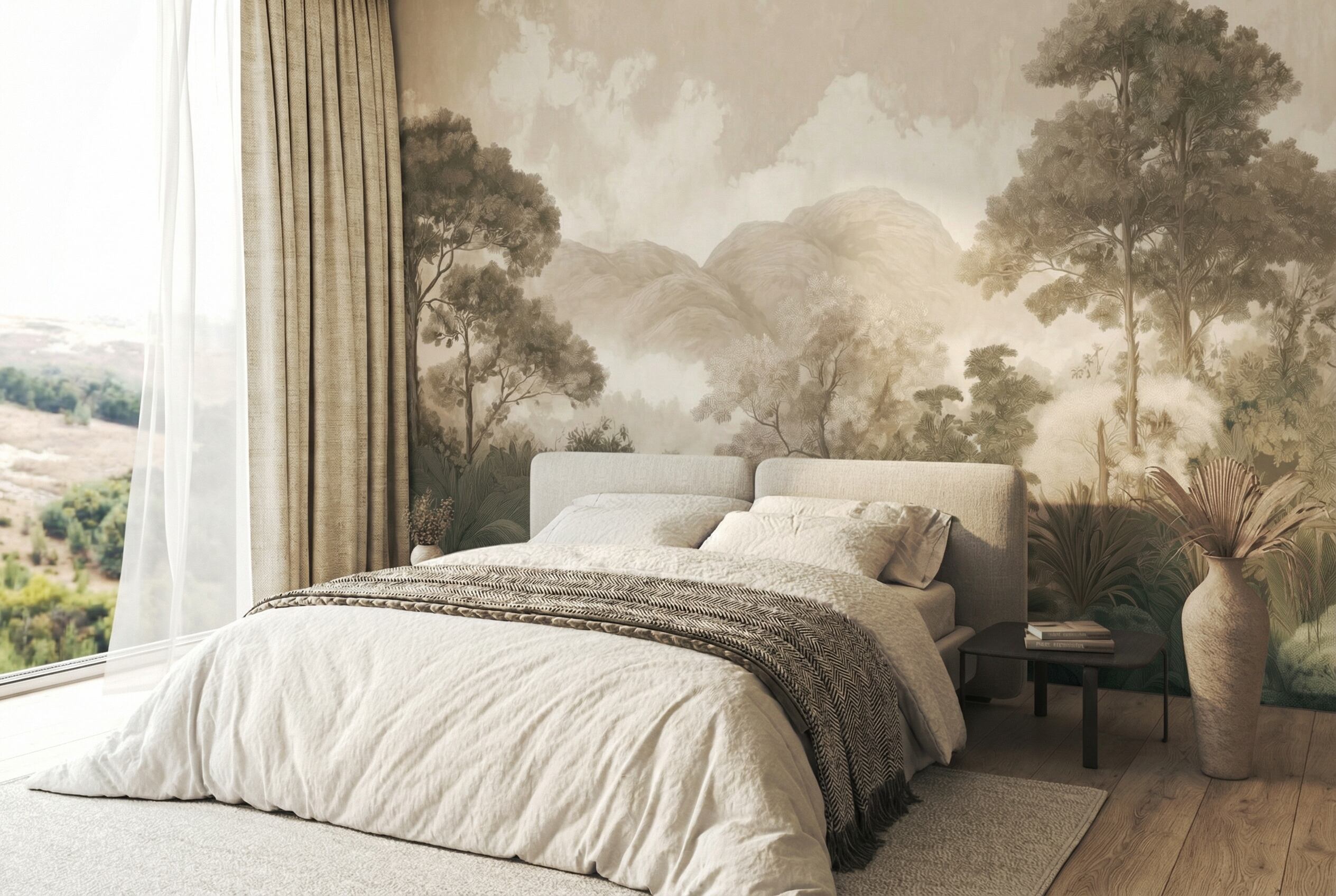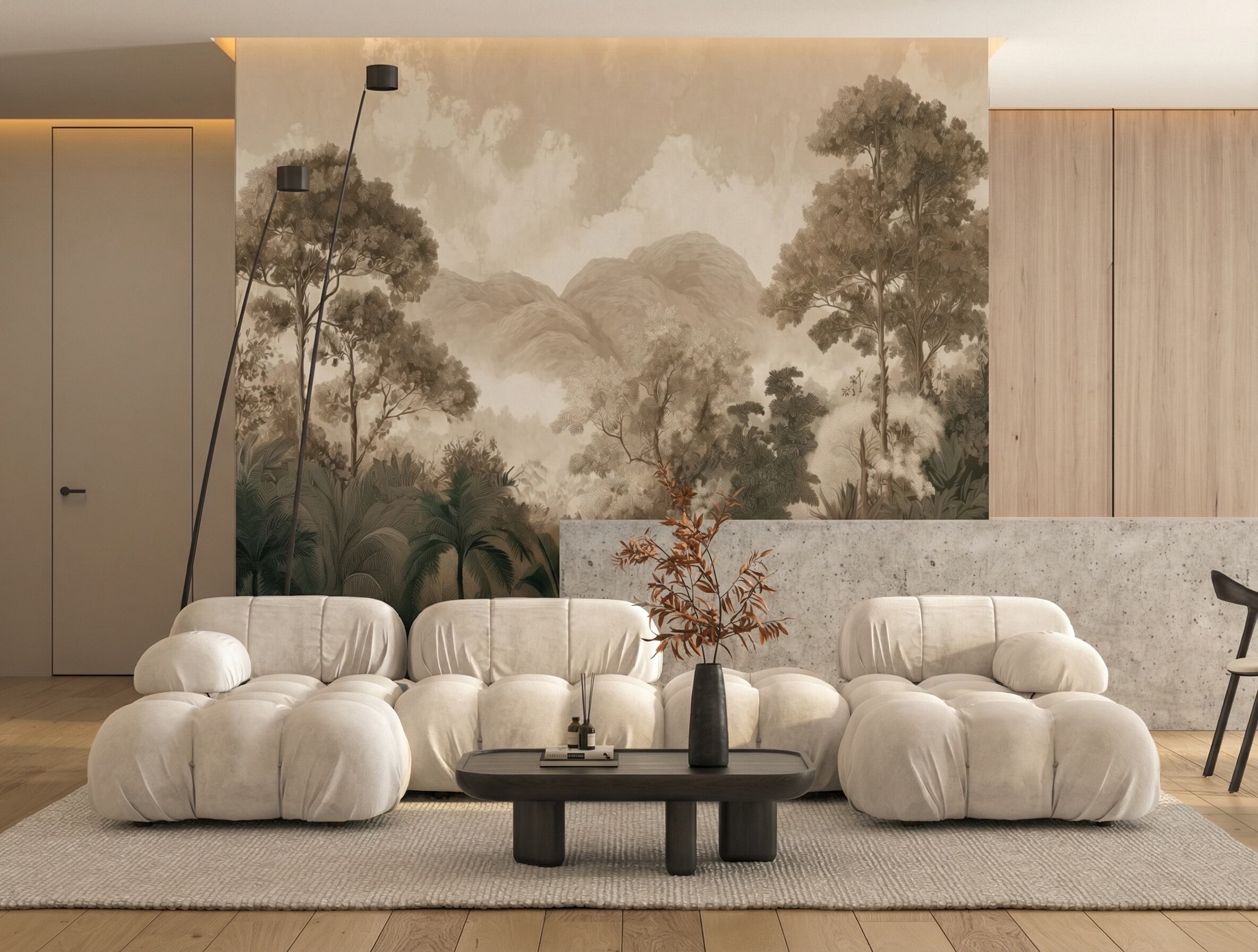 霞(Kasumi)は、霧に包まれた静かな風景を描いた、穏やかで奥行きのある壁紙です。やわらかな木々のレイヤーがかすむ地平線へと溶け込み、葉や遠くの丘がひとつの優しい情景として広がります。落ち着いたグリーンと温かみのあるニュートラルトーンが、強いコントラストを使わずに自然な深みを生み出し、空間にゆったりとした静けさをもたらします。朝霧が少しずつ晴れていく森の中に立つような感覚を呼び起こし、心を整える穏やかな時間を演出する一枚です。