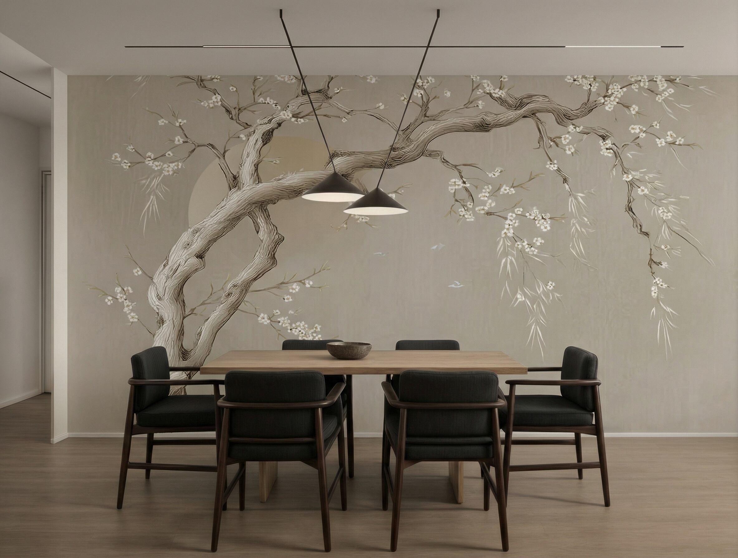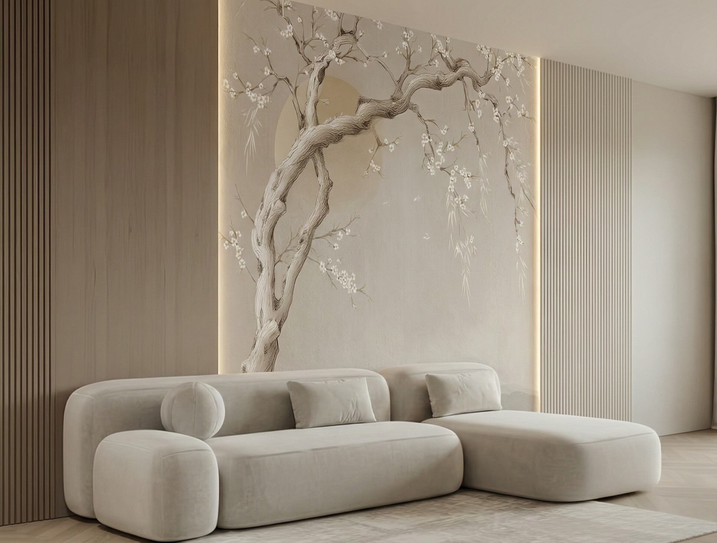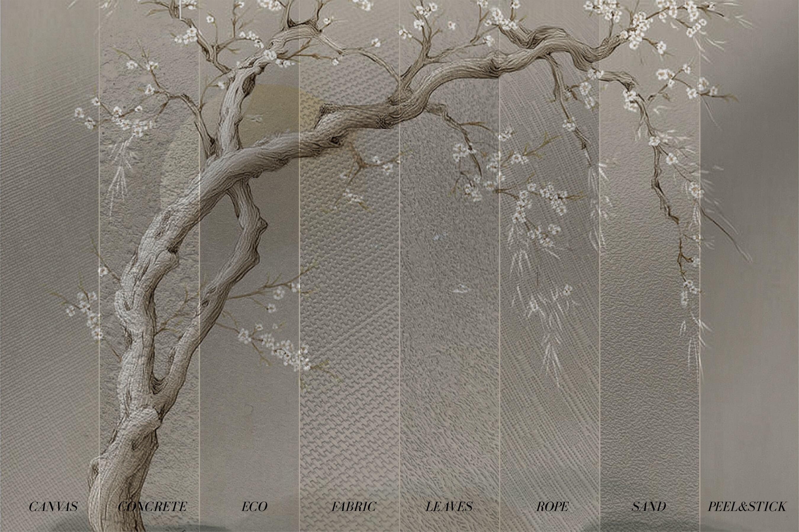 移ろい(Utsuroi)は、変化の中に宿る静かな美しさを映し出した、繊細で余韻のある壁紙です。空間をゆるやかに横切る枝がやさしくたわみ、その先に咲く淡い花々が時の流れの中にそっと留まるように描かれています。やわらかなニュートラルトーンと流れるようなラインが、季節と季節のあいだにある一瞬を捉え、芽吹きと手放しが同時に存在する感覚を表現します。移ろいゆく自然の姿を穏やかに映し出し、優雅さと静けさ、そしてほのかな動きを空間にもたらす一枚です。