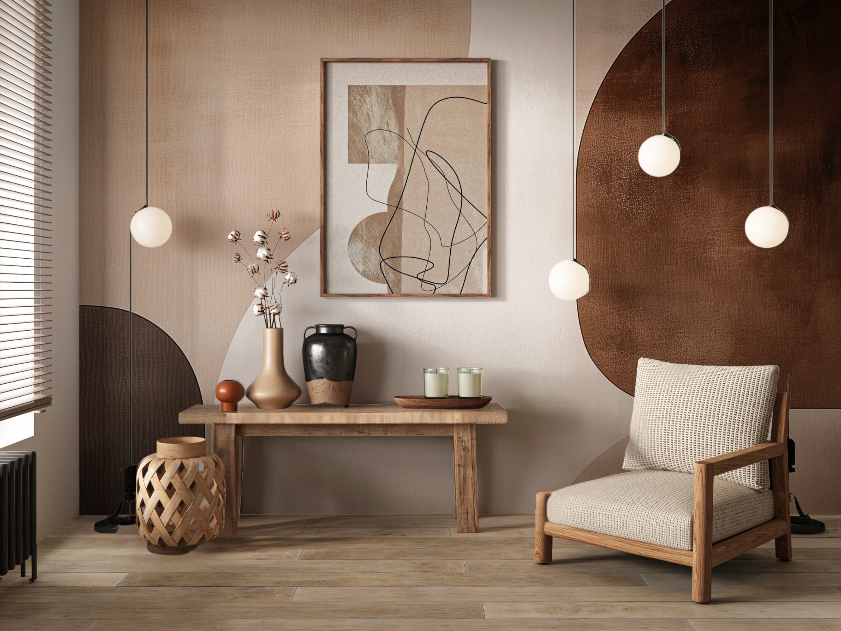 Jin Softデザインは、曲線を落ち着いたアースカラーで描いた、ジャパンディスタイルです。クリーミーな白を背景に、深いチョコレートブラウン、チャコールグレー、ウォームベージュの厳選されたパレットで、大胆で流れるような曲線と丸みを帯びた長方形が描かれていて、これらのソフトで立体的なフォルムは、落ち着きと安定感を保ちながら、壁全体にリズミカルな流れを生み出すようにデザインしました。