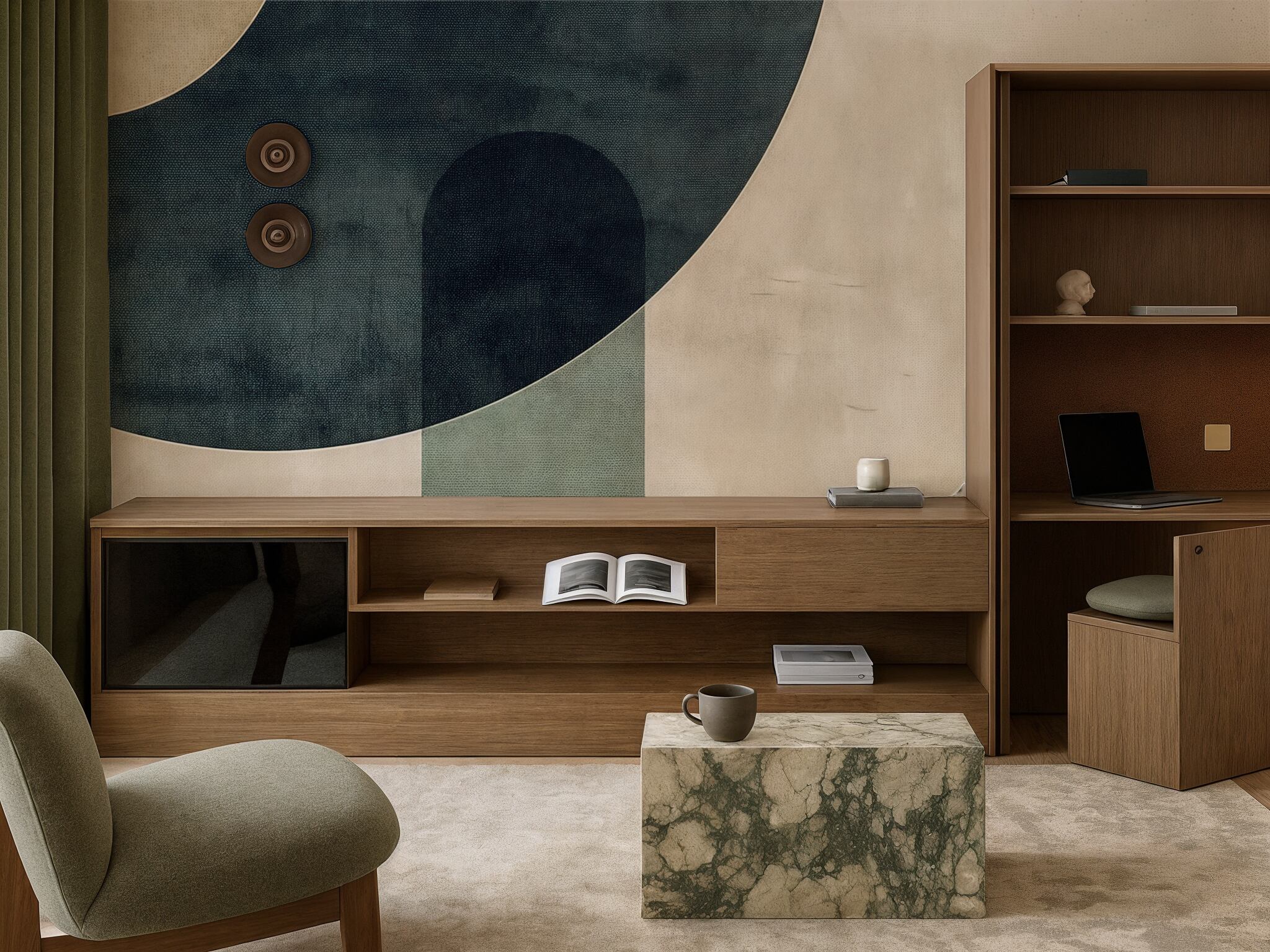 Aoi Whisperは、洗練された曲線とアースカラーを組み合わせて、力強い模様を描いたデザインです。深みのある青緑色と森のような緑色で描かれた大きな円は、暖かみのあるクリーム色をバックに美しく描かれています。この壁紙を使うことで、壁がモダン・アートの一部になったような印象を作り出し、自然にインスパイアされた淡い色調と特徴的な模様は、相互作用によって視覚的な面白さを表現しながらも、静寂さを生み出しています。