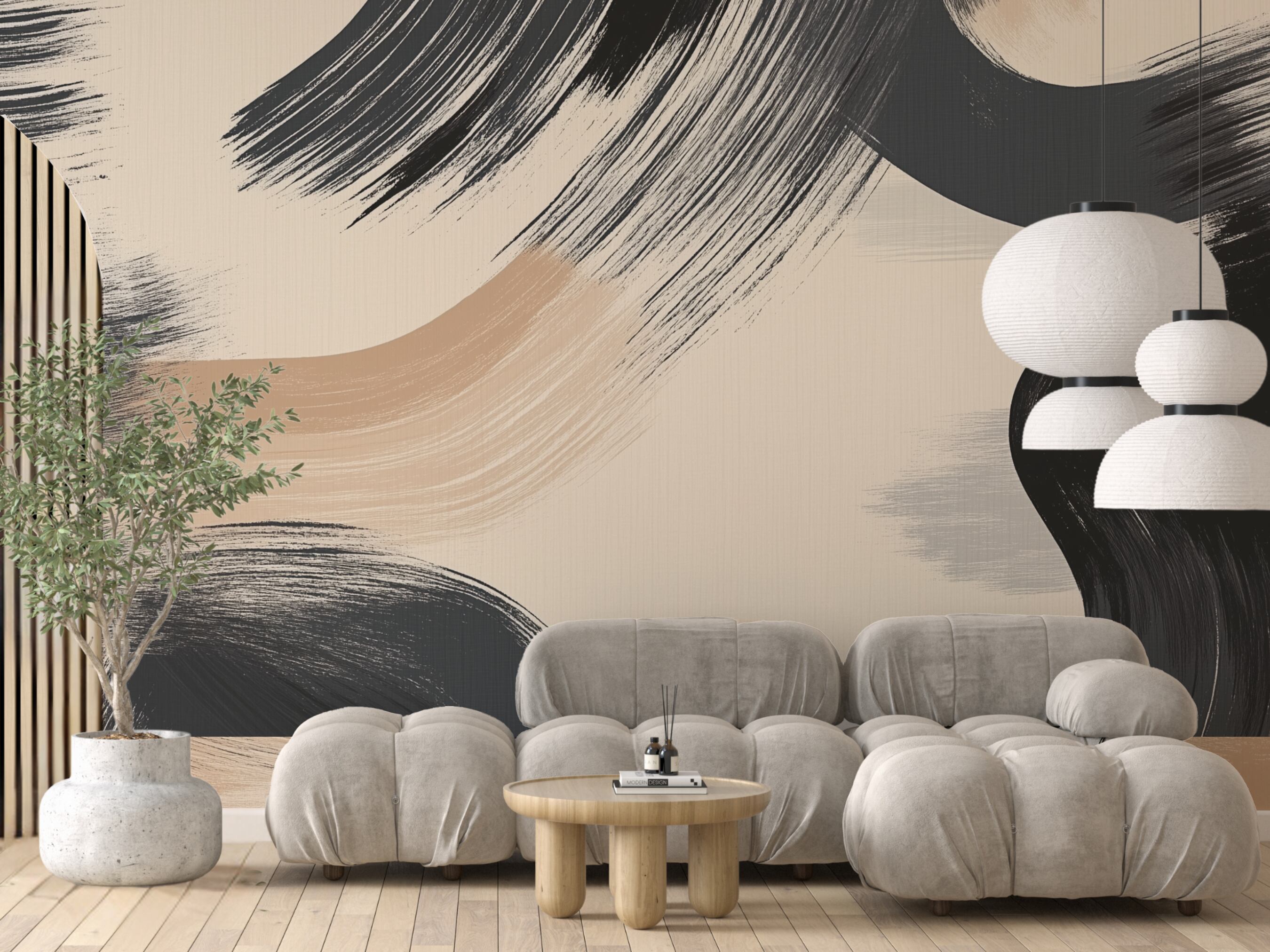 Kiyo Sweepは、伝統的な日本の水墨画の本質と、現代のミニマリズムが融合した壁紙デザインです。温かみのあるベージュを基調とした背景に、深い墨色の大胆な筆致が躍動感をもって描かれています。余白との関係性が生み出す空間は、モダンでありながら凛とした趣を醸し出します。大きな筆で描いたような力強いタッチは、墨の濃淡によって自然な表情を見せ、まるで波や風に漂う雲のような有機的な動きを感じさせます。
