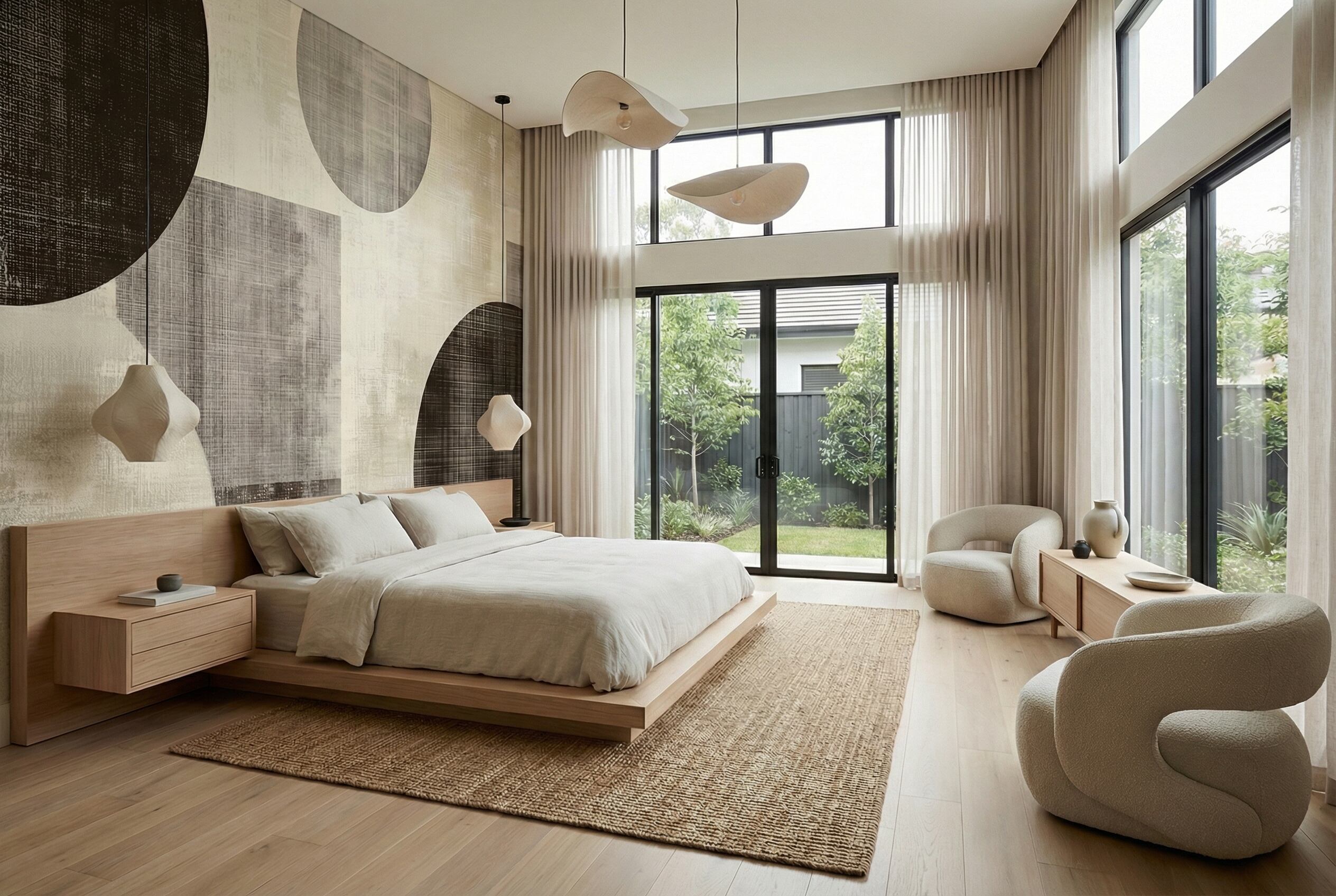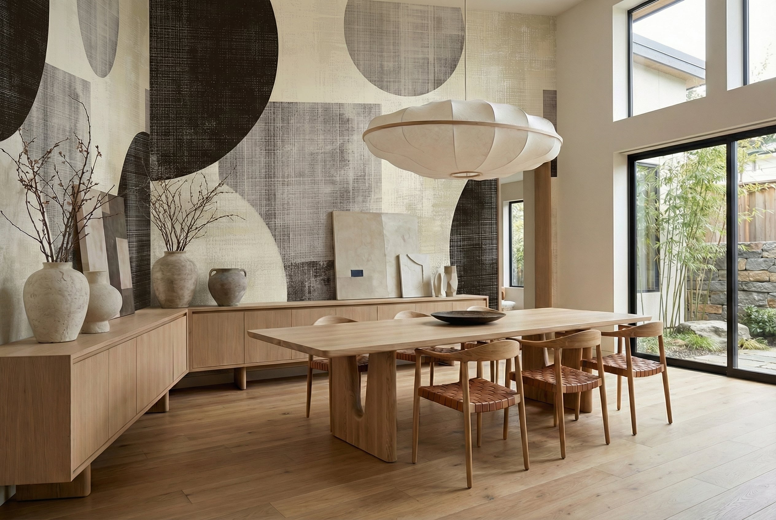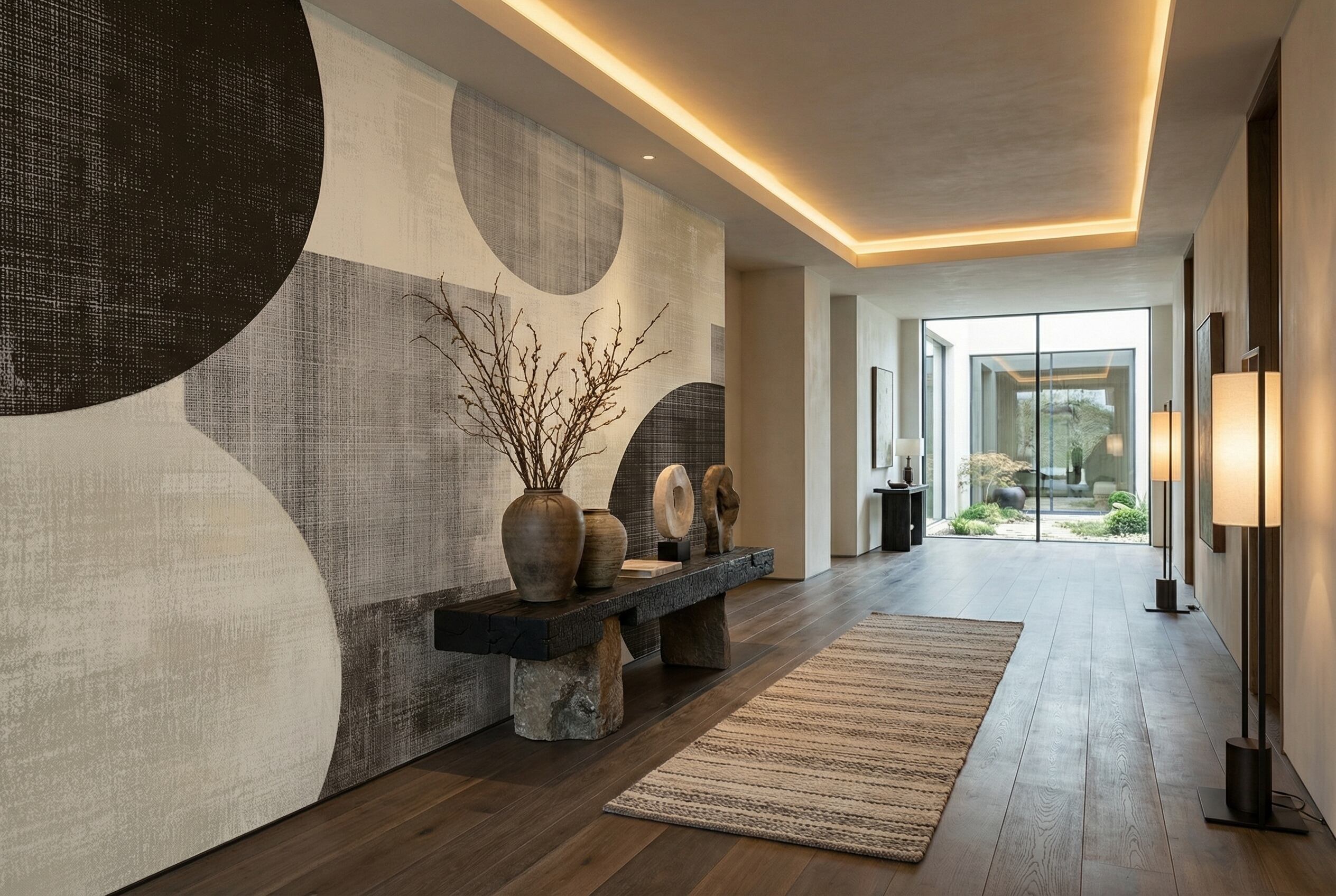 Riko Textureは、幾何学的なフォルムと奥行きのあるテクスチャの大胆なコントラストで空間に存在感をもたらします。モノクロームのパレットで描かれた円と長方形が洗練された構成を生み出し、深みのあるチャコールブラック、繊細なグレー、そして温かみのあるアイボリートーンが調和しています。全体に施された特徴的なクロスハッチのテクスチャは、日本の伝統的な織物を思わせる繊細な質感を演出。大きな円形のモチーフがニュートラルな背景の上に浮かび上がることで、奥行きと動きを感じさせ、平坦な壁をダイナミックな建築的空間へと変貌させます。