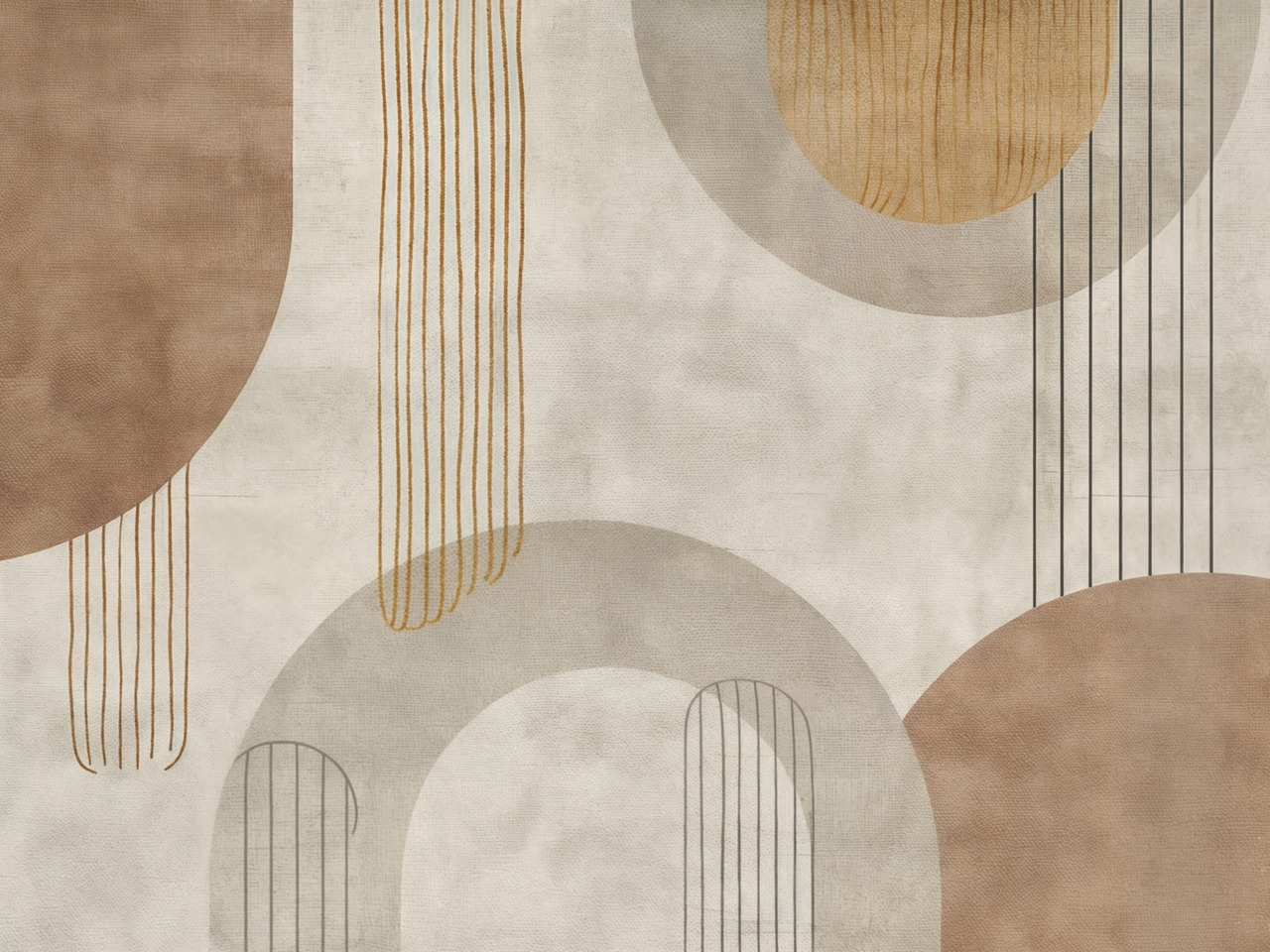 Satori Waveは、柔らかな月のような球体が、穏やかなベージュと温かみのあるグレーのトーンでクリーミーなキャンバスの上に浮かび、繊細な金色とグレーの縦のラインが雨や音楽の弦のように静かに降り注ぐ様子を表現したデザインです。