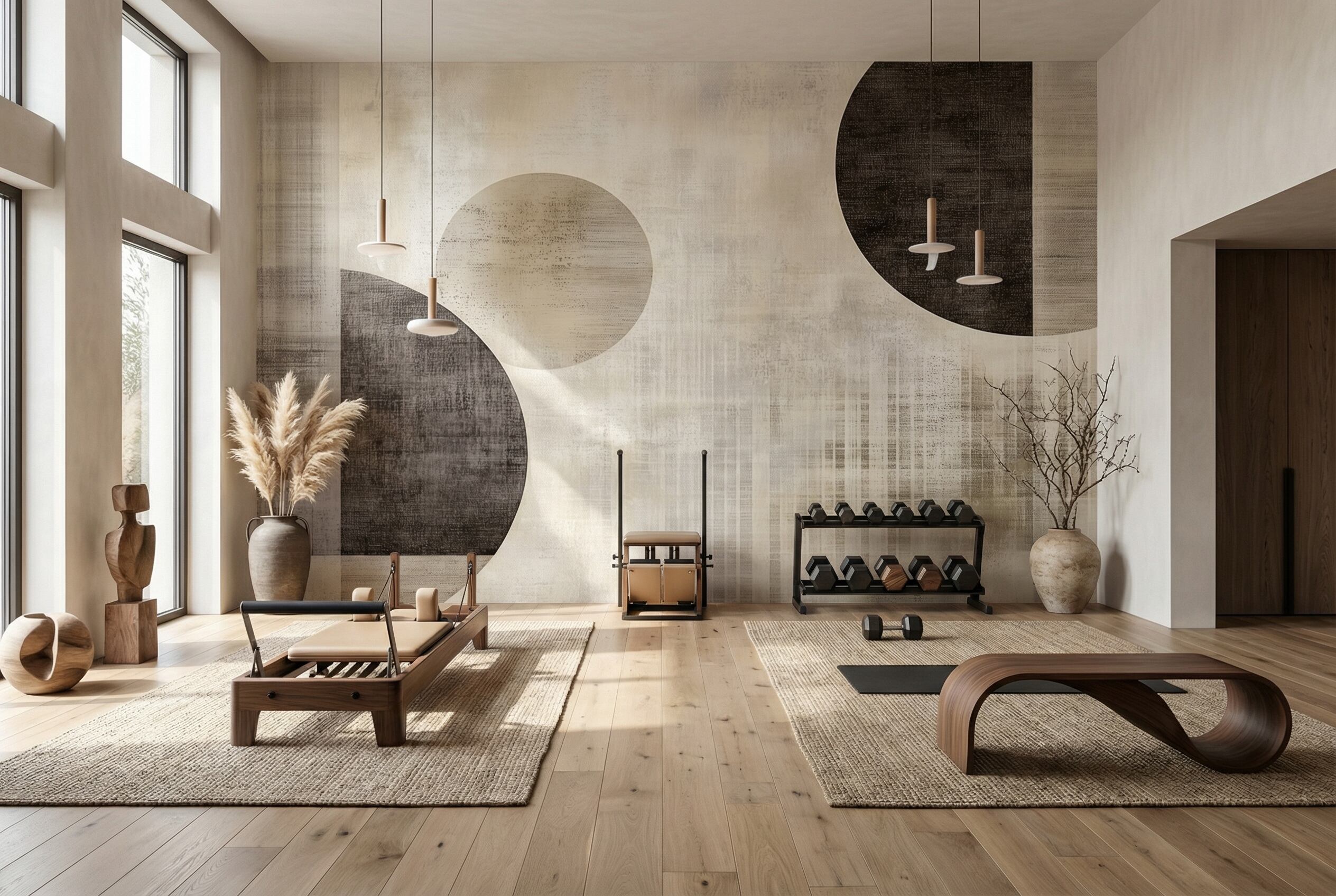 構成は、深みのあるチャコールの円が二つ、やわらかなトープの円が一つ、不均衡の中に洗練を感じさせる絶妙なバランスで配置され、風合いのあるクリーム色の背景に浮かび上がります。円の重なりと余白が生み出すリズムは奥行きを生み、各形状に宿る繊細な質感が、侘び寂びの美学が称える有機的な不完全さを優雅に表現しています。