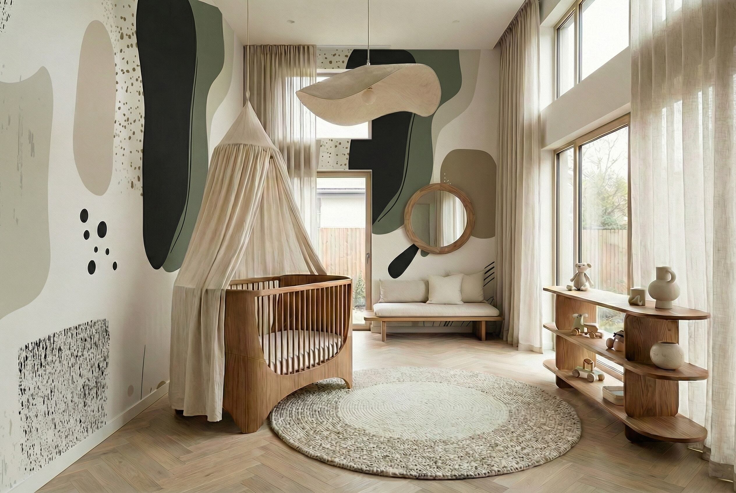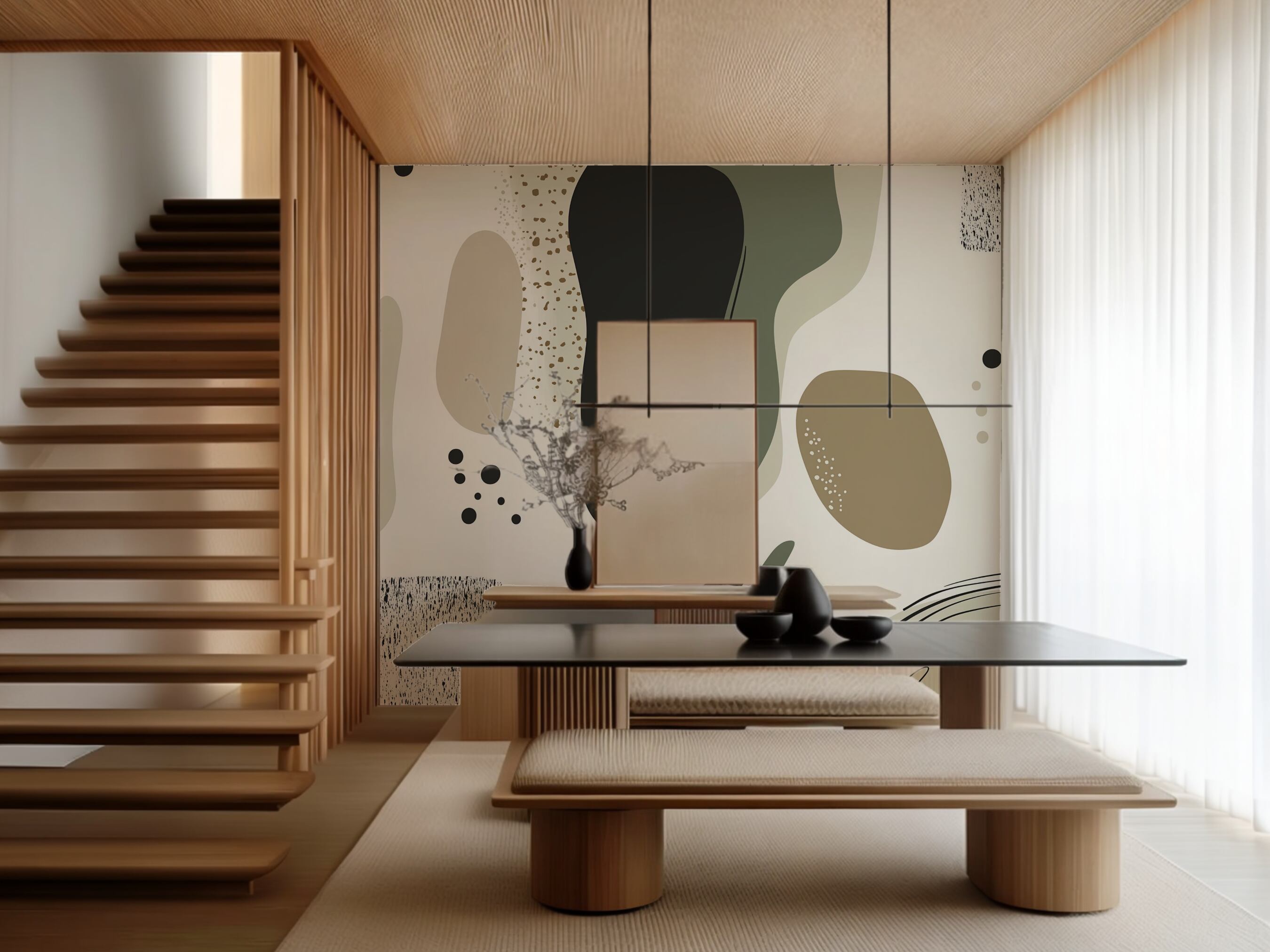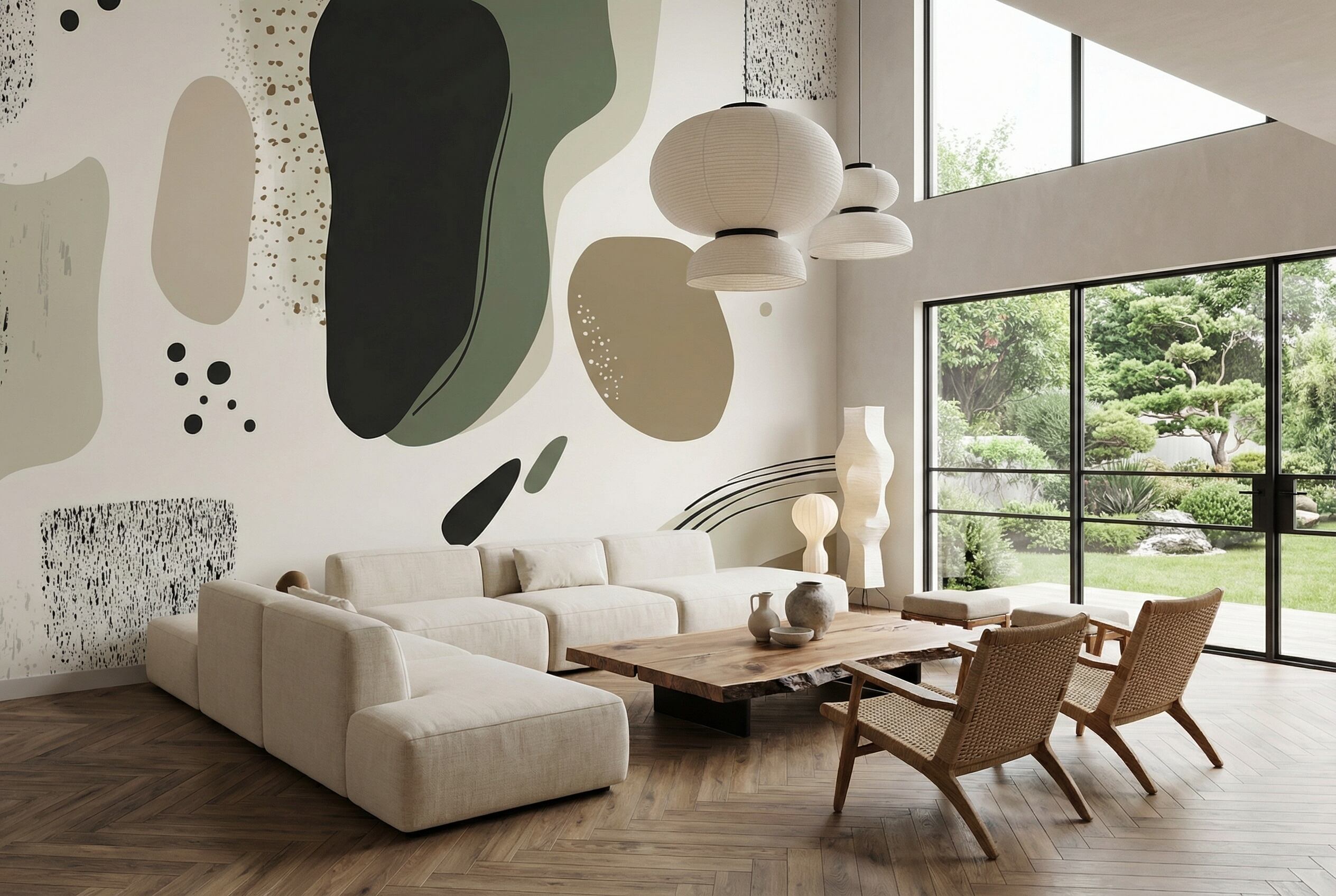Take Speckleは、流れるような非対称のフォルムが、セージグリーン、チャコールブラック、ウォームベージュ、ソフトクリームの調和のとれたカラーパレットで描かれ、澄みきった白い背景の上にふわりと浮かぶような印象を与えます。特に目を引くのは、異なる質感の巧みな組み合わせ。ソリッドな色面に繊細な斑点模様が重なり、舞い散る砂や雨粒のような表情を生み出しています。