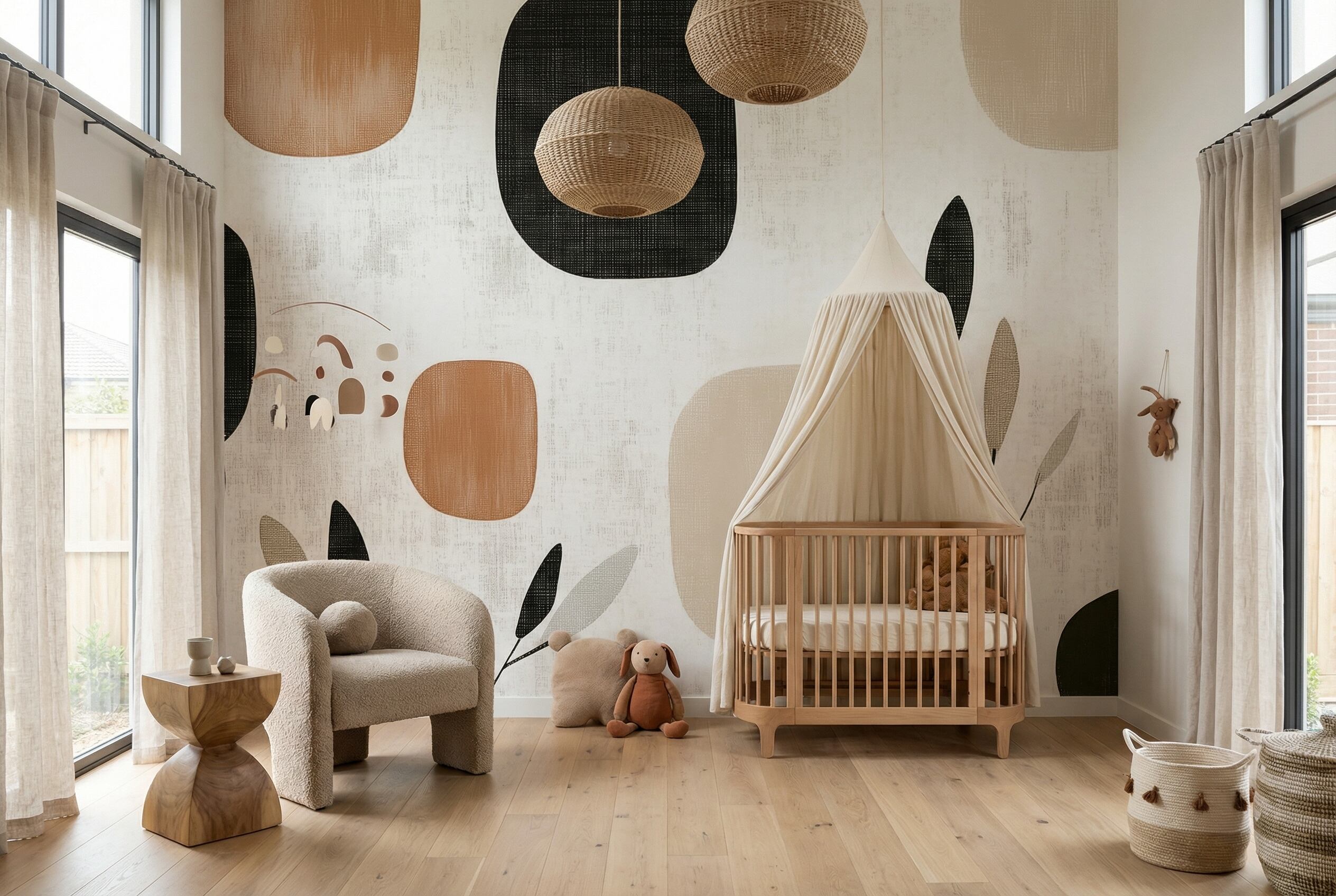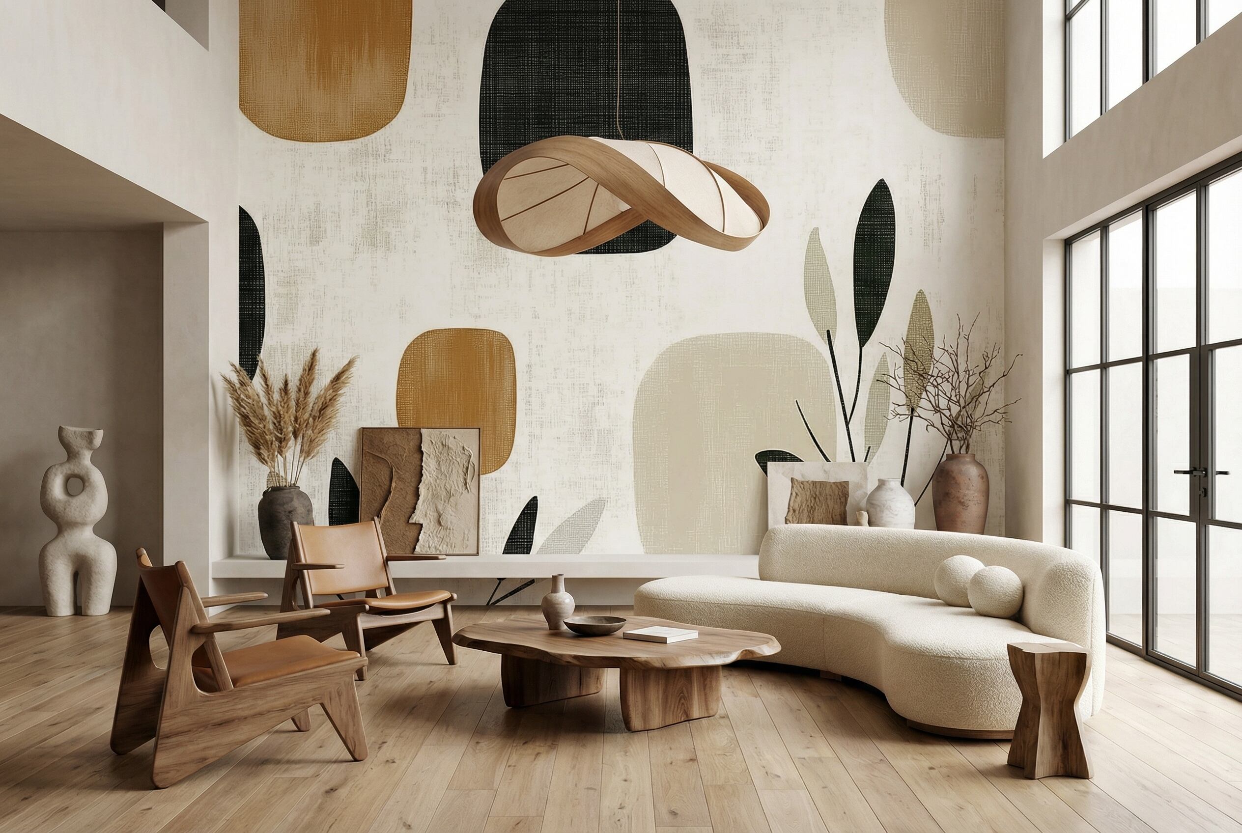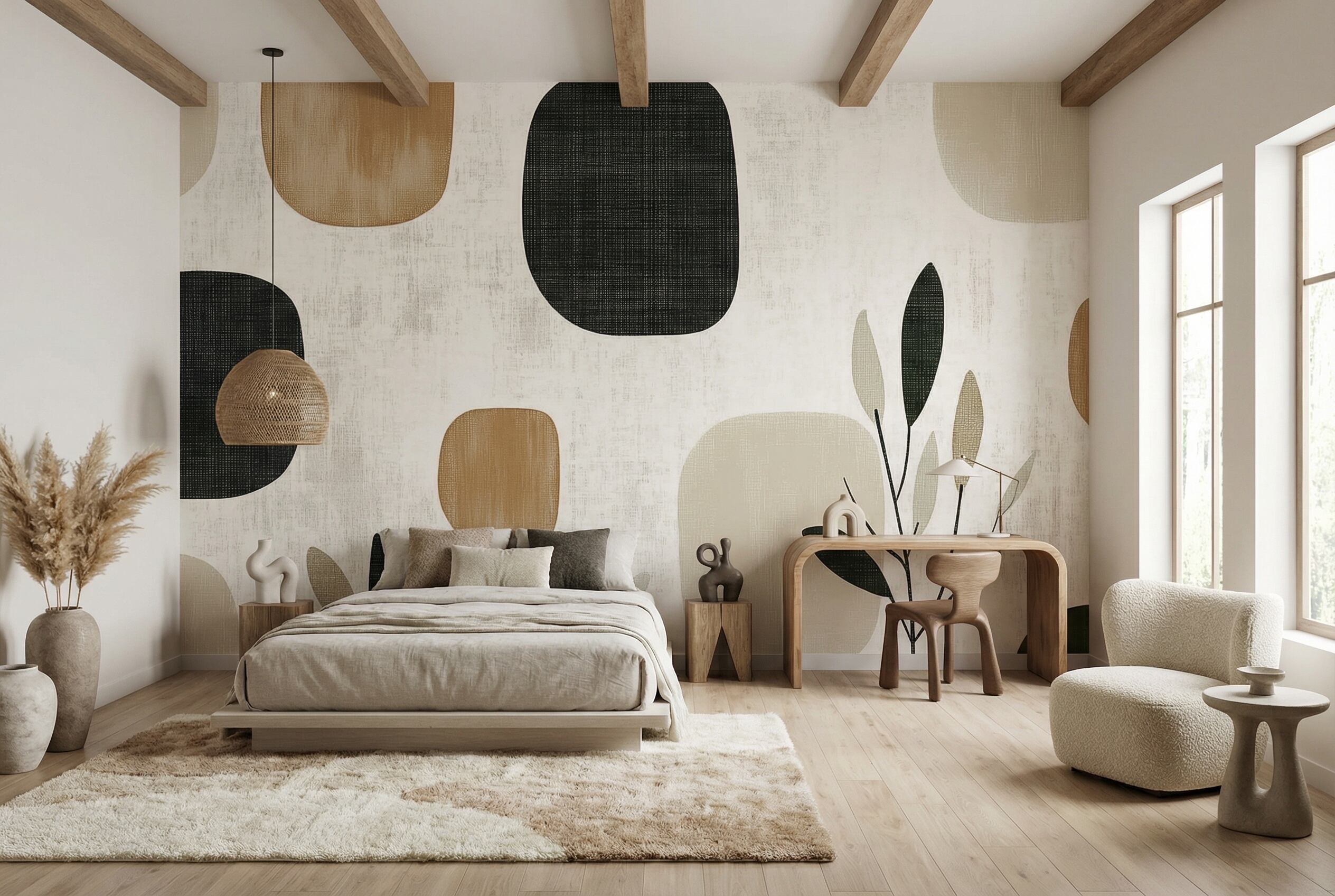 優しい茶色、シャープなチャコールブラック、落ち着いたベージュの有機的な丸みを帯びた幾何学模様が、テクスチャーのある白地に映える洗練されたデザインです。バランスの取れたリーフモチーフが、自然の動きと視覚的な魅力を添えています。ナチュラルなカラーパレットと汎用性の高いパターンは、様々な家具やインテリアとの相性が抜群です。落ち着きのある寝室、くつろぎのある玄関、穏やかなリビングなど、どのような空間にもマッチするデザインです。